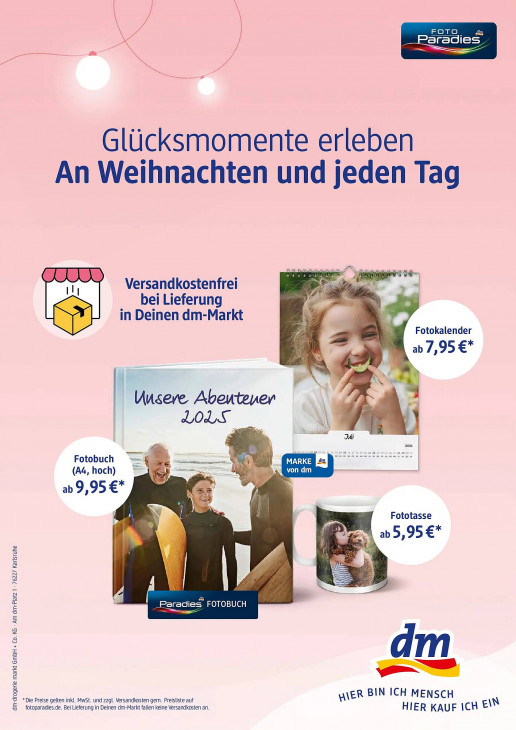 Bitte beachten Sie, dass dieser Text automatisch generiert wird und möglicherweise Fehler enthältHE Cr Glücksmomente erleben An Weihnachten und jeden Tag Versandkostenfrei | in Deinen dm-Markt bei Lieferung ”. Fotokalender ab 7 95 €* | | Unsere Abentener 7 LOLS ul Hi Fotobuch ne MARKE (A4, hoch) Kalk: lu) ab 9 95 € Fototasse à ) ab 5 95 €” RE TS MD an FOTOBUCH dm dm deens markt GmbH + Co. KG : Am dm-Platz 1 - 76227 Karlsruhe ne kane Be a Lieferung it n Dei a n SE kt fallen kei Be 5 ne an. inkl. MwSt. ui Iko: wieR BIN ICH MENSCH HIER KAUF IC H EN